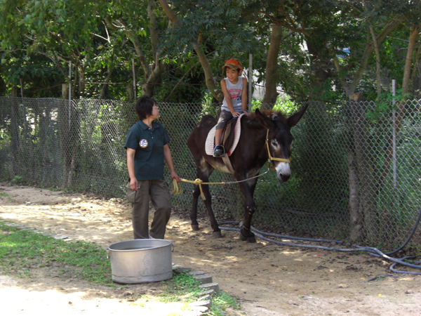 ロバ乗り初体験。飼育員さんと何を話してるんでしょうか。
