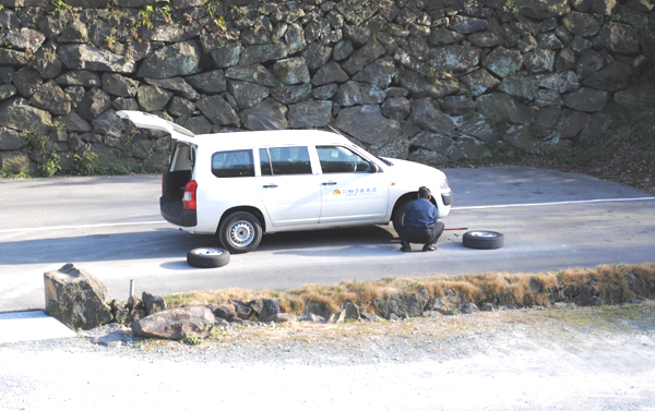 Y課長、夕方スタッドレスタイヤをノーマルタイヤに交換しておりました。