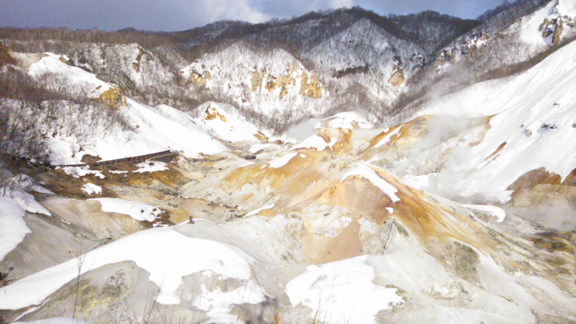 まずは、地獄谷の見学です。到着次第、バスの中まで硫黄の臭いが、、、