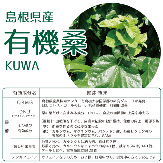 桜江町の桑には、そのQ3MGが多く含まれ、LDLコレステロール低下、抗動脈硬化、肝機能改善等が期待できます。