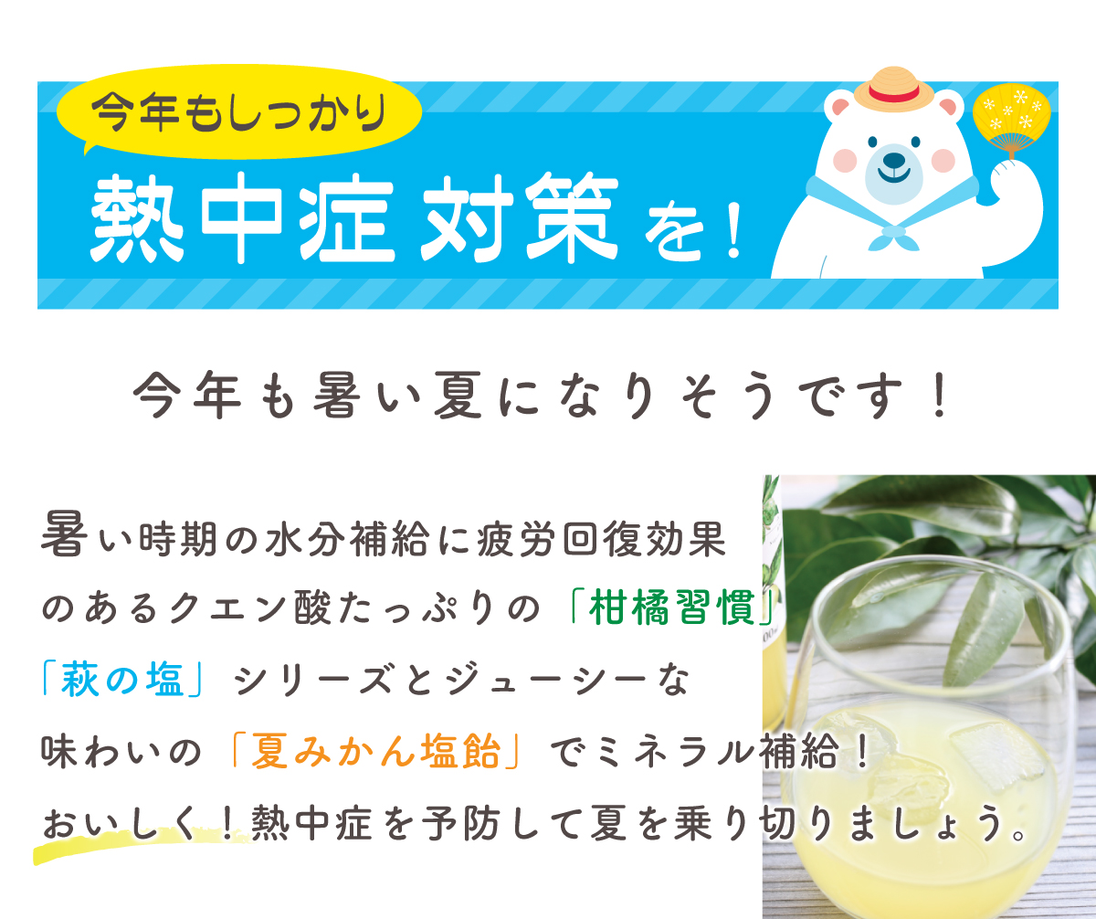5種類の柑橘のブレンド果汁 「柑橘習慣」はクエン酸がたっぷり 夏バテ防止にも、疲労回復効果で 夏を乗り切りましょう! また、ミネラル補給の吸収促進効果も あると言われており夏も大活躍です。
